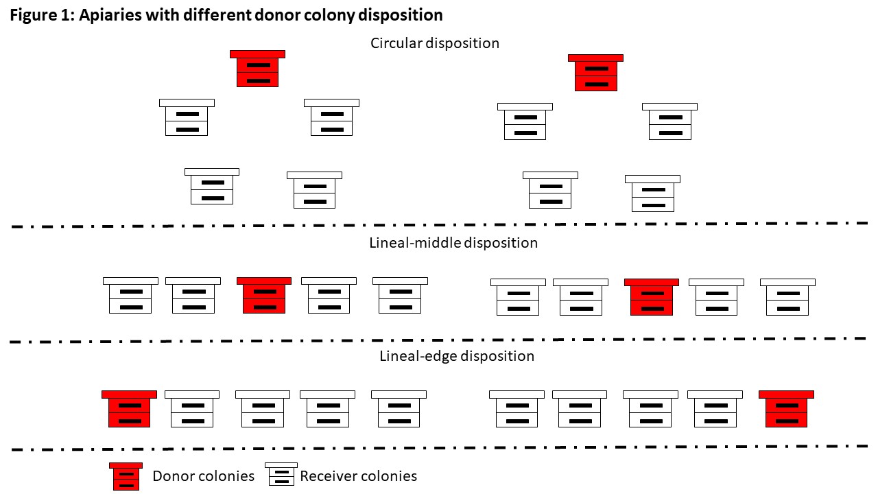 Two apiaries in a circular arrangement, each with a donor colony in the center of the arrangement